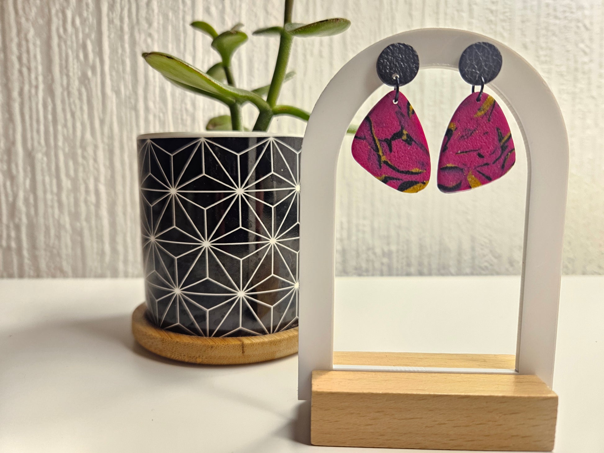 Gold-on-black-on-magenta patterned drops. For that jazzy energy. Lightweight and made for sensitive ears.