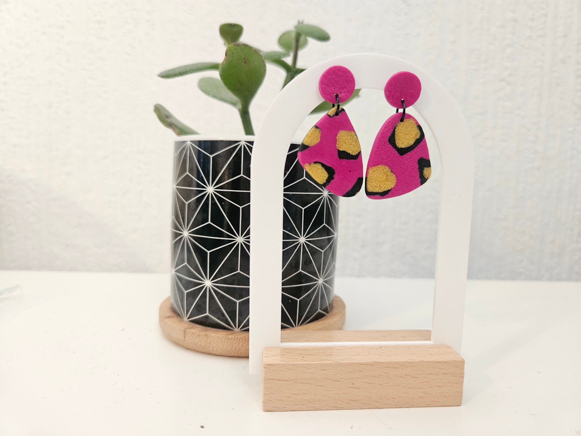 Pink-on-pink leopard drops with black and gold spots. For an understated urban jungle energy. Lightweight and made for sensitive ears.