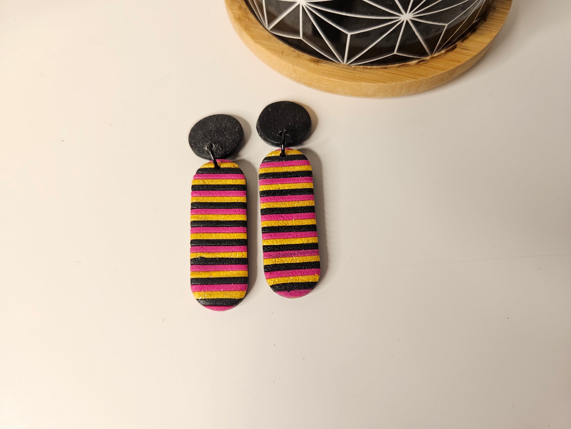 Long graphic striped dangles in pink, gold and matte black. The stripes are layered by hand. Lightweight, Sensitive-ear friendly and fun.