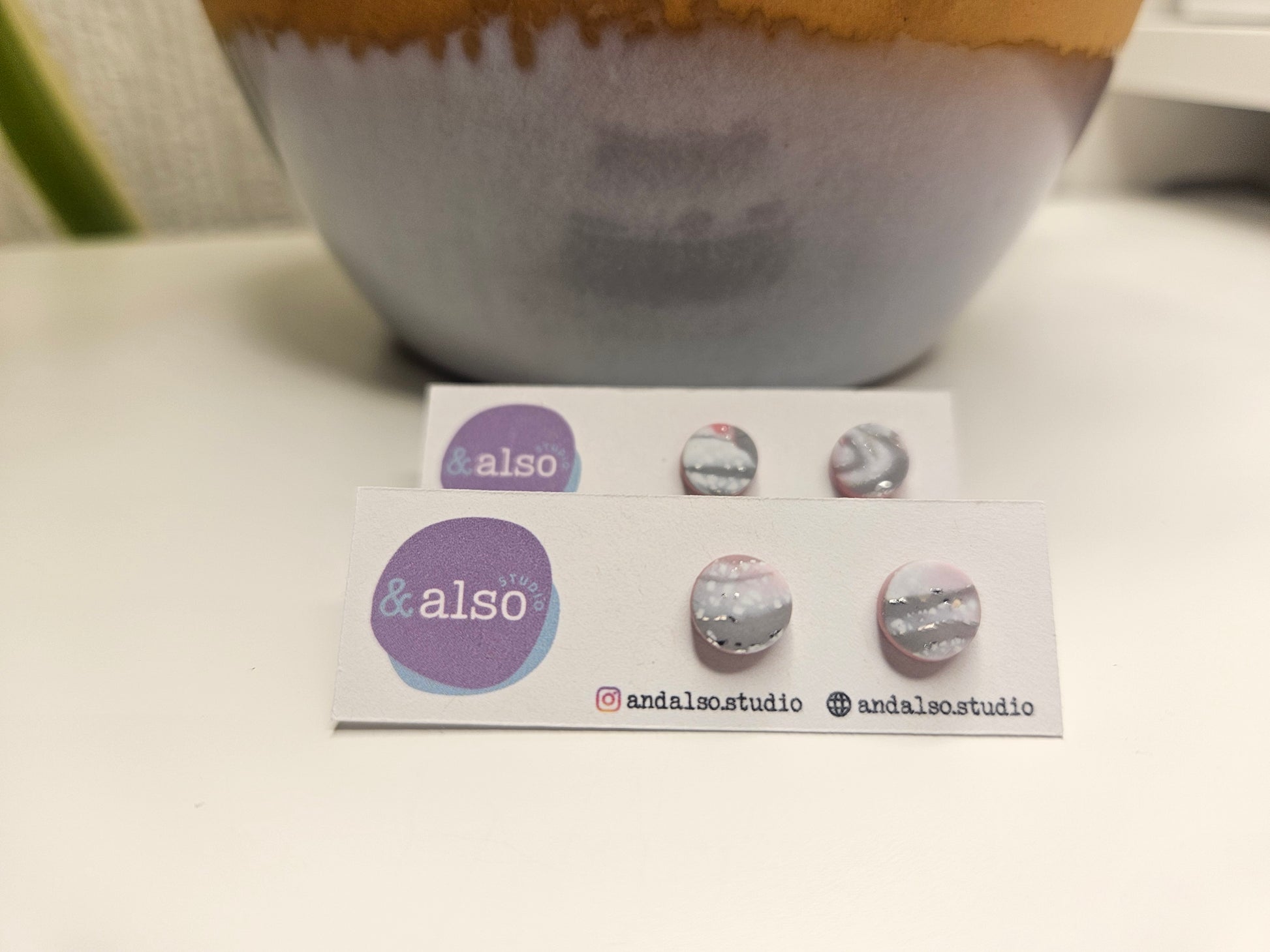 These smaller 6mm studs have gentle mist-like stripes in rosy pink, white and grey, with a subtle shimmer woven through. Each pair forms its own quiet pattern, so no two are the same. Hand-rolled polymer clay. Ultra-light and comfortable, with sensitive-ear friendly syrgical steel at the back. Handmade with love and chaos, as always.