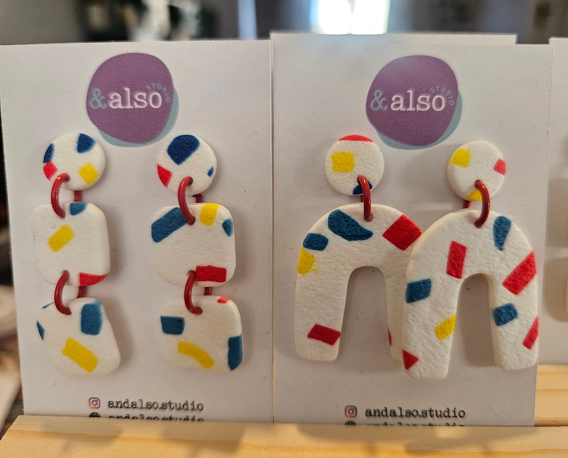 Chunky, playful arches in a fun confetti palette of red, blue and yellow fragments set into a soft white textured base. These lightweight polymer-clay dangles bring instant fun to any outfit and are finished with red links for extra brightness.