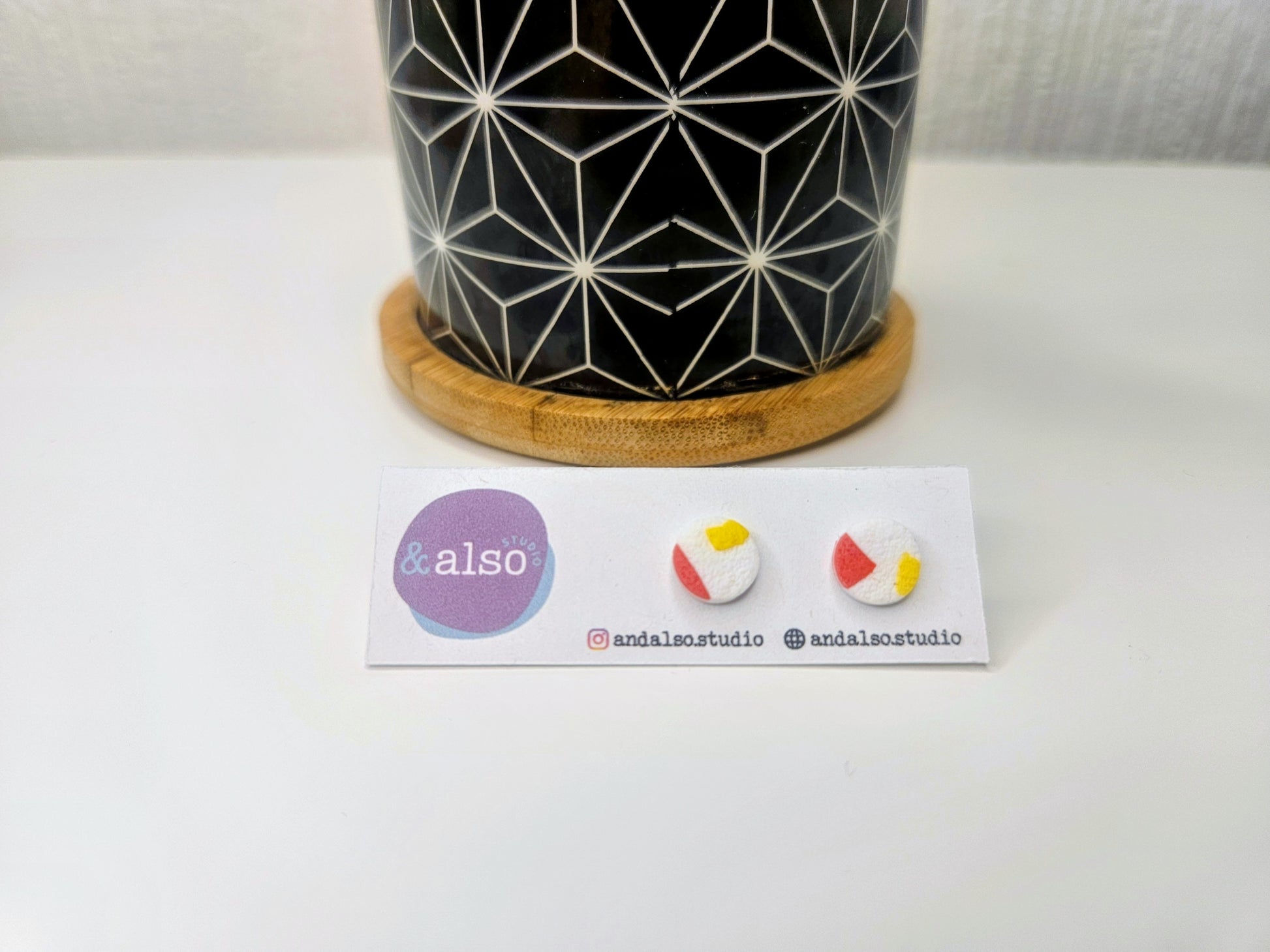 A mix of red and sunny yellow shapes on matte white clay. Light, 80s vibes in small (6mm) studs.