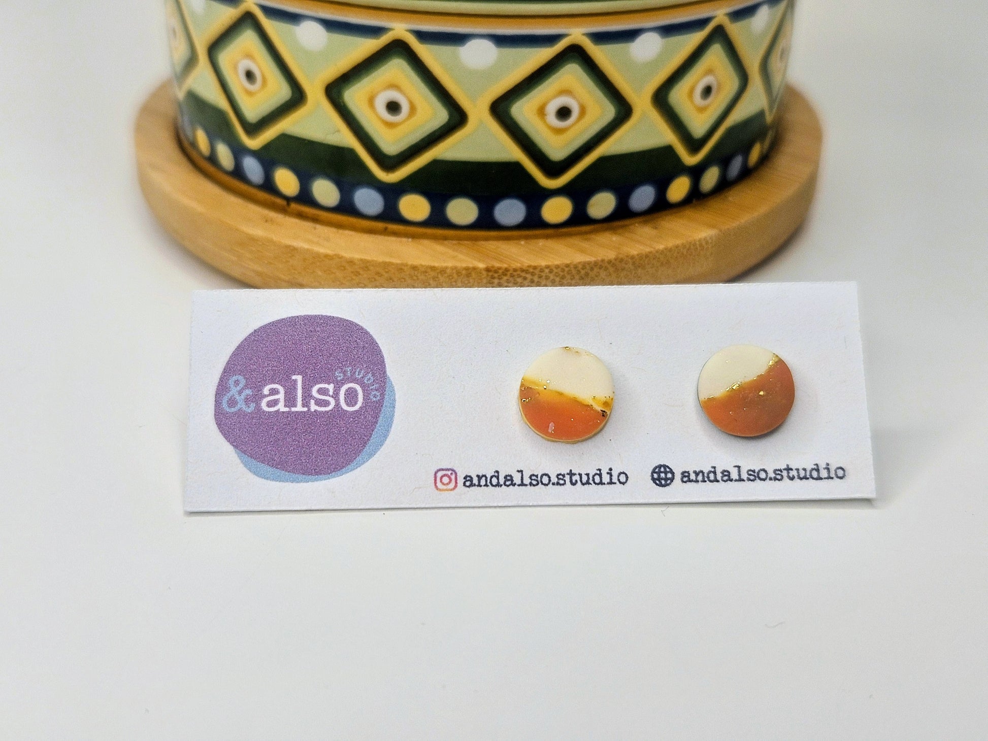 Burnt orange and soft cream clay meeting in a clean split, accented with touches of gold leaf. Understated, earthy and versatile. Small studs (6mm)