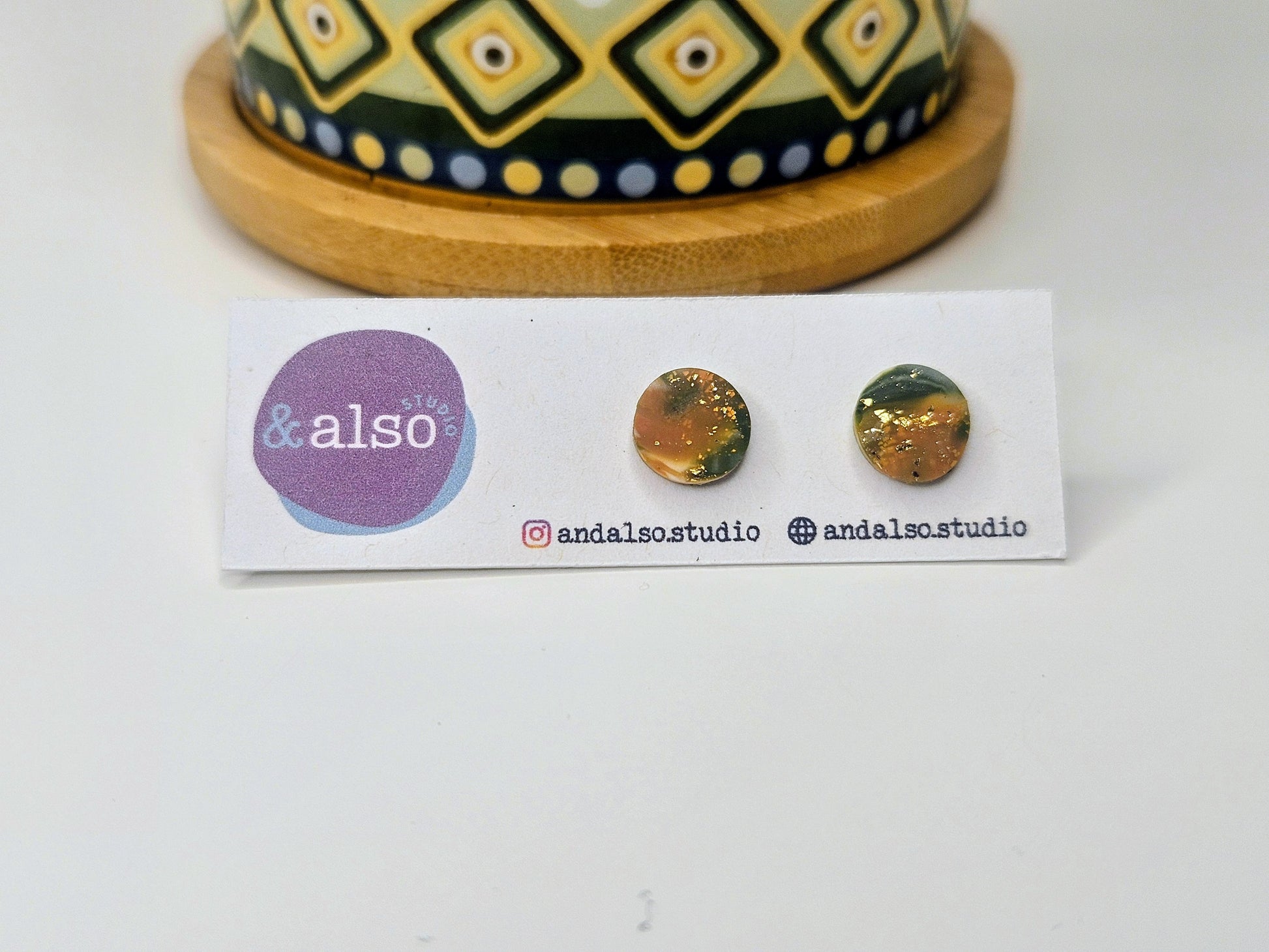 Ember orange blends into green and cream with light touches of gold leaf. Warm, earthy tones with soft, organic movement. Small studs (6mm)