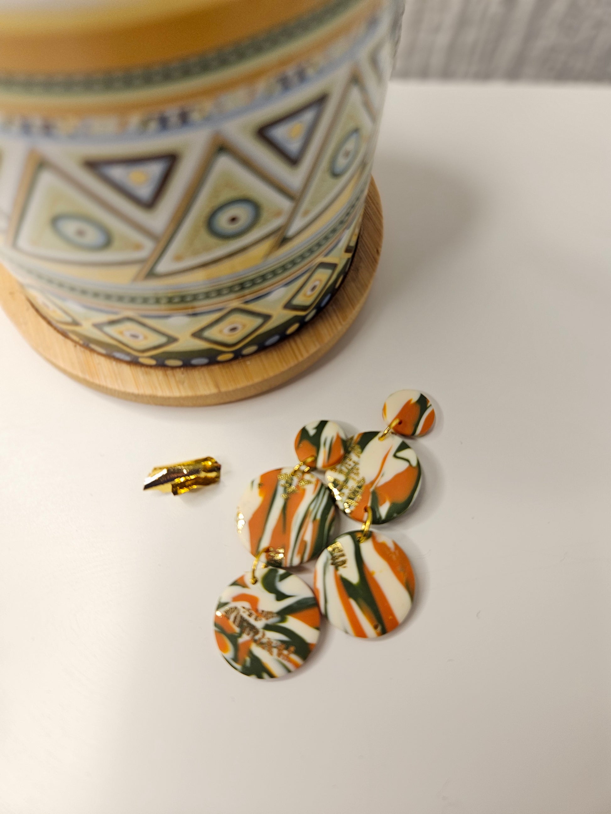 A bold trio of marbled circles in deep green, ember orange, soft cream and gold leaf. Each pair has its own swirl, so no two are exactly the same.