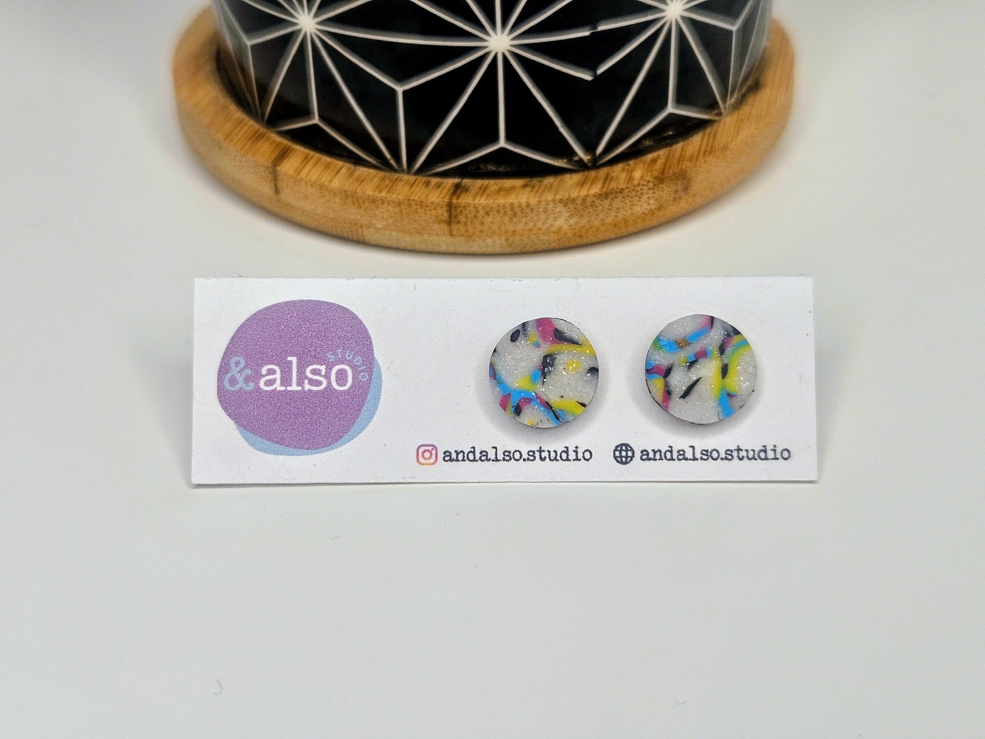 A white base scattered with tiny neon flecks for a clean, fun confetti effect. Light, bright and easy to wear. Large (10mm) studs.