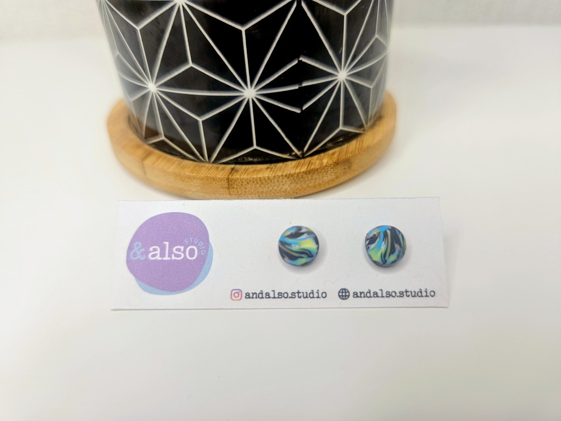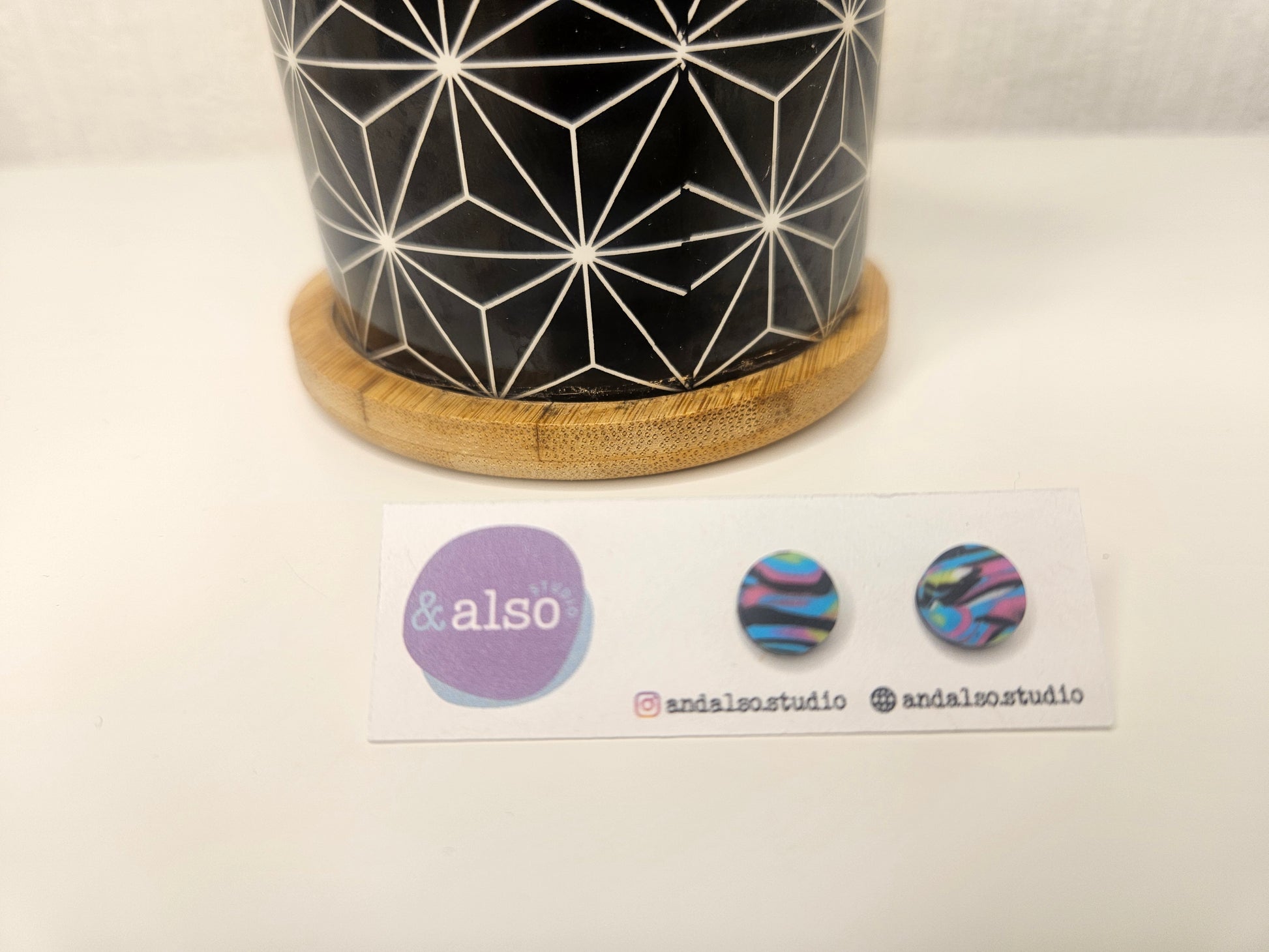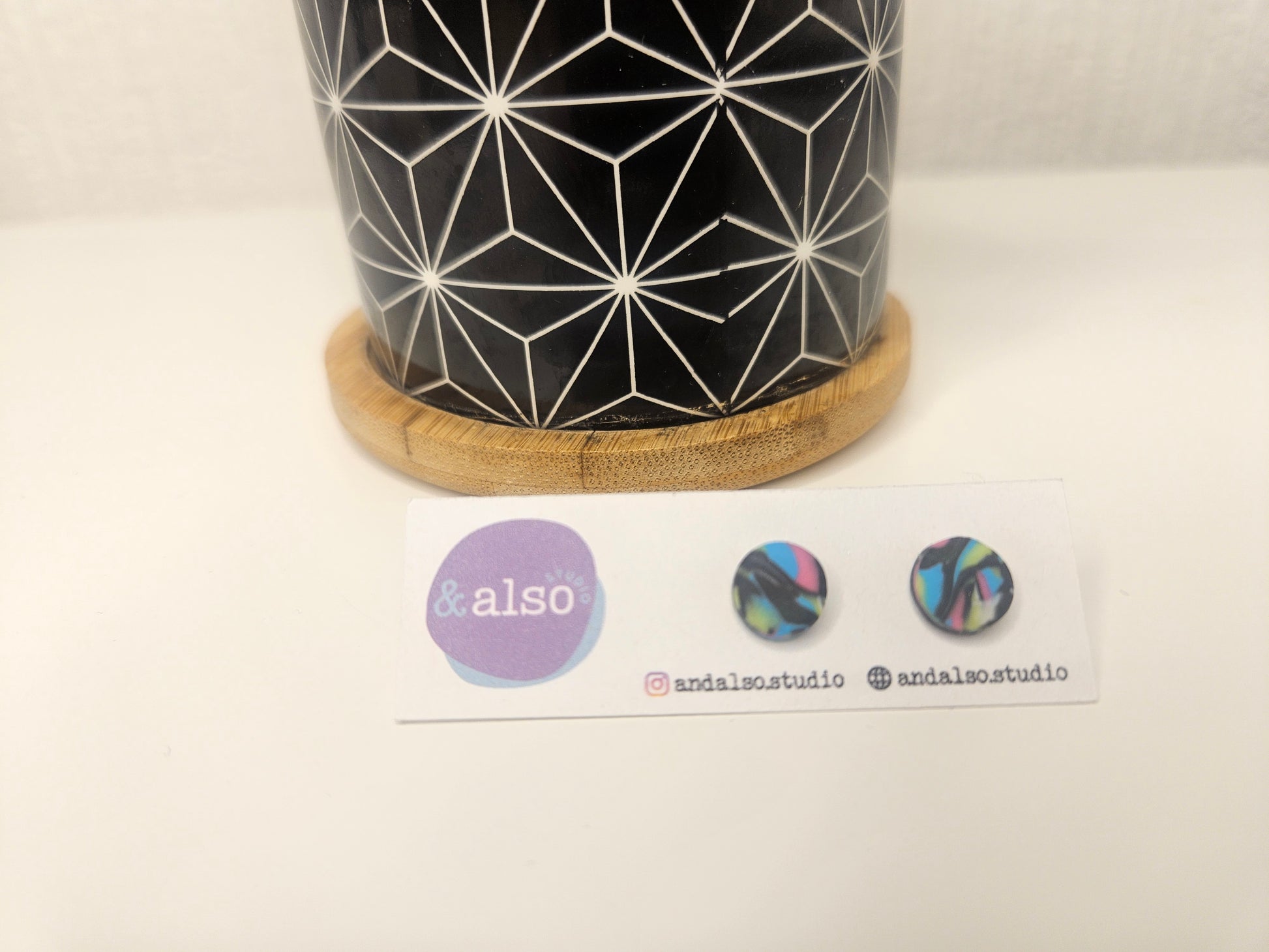Subtle neon marbling in smaller swirls. A softer take on the collection, with just the right pop of colour. Small (6mm) studs. The handmade variations, as seen. Feel free to contact me after you order if you have a preference.
