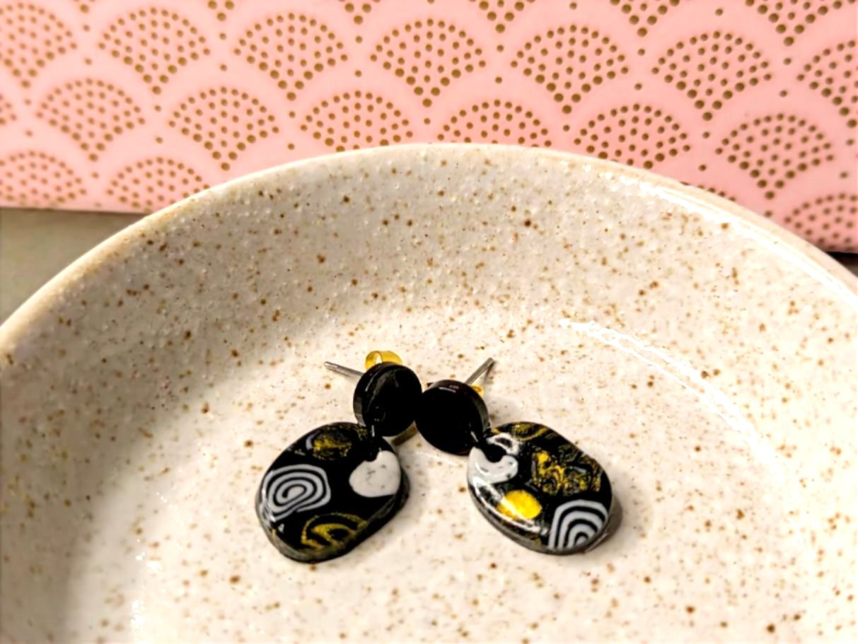 Embrace the enchanting allure of city nights with the Nightfall Bean Dangle earrings. Swirling black, white, and shimmering gold tones play together like sparkling city lights, catching every glimmer just for you. These earrings bring a dash of midnight magic, perfect for adding bold elegance. Let your style dance in the moonlight (or sunshine, or cloud) with these captivating, vivacious charms.