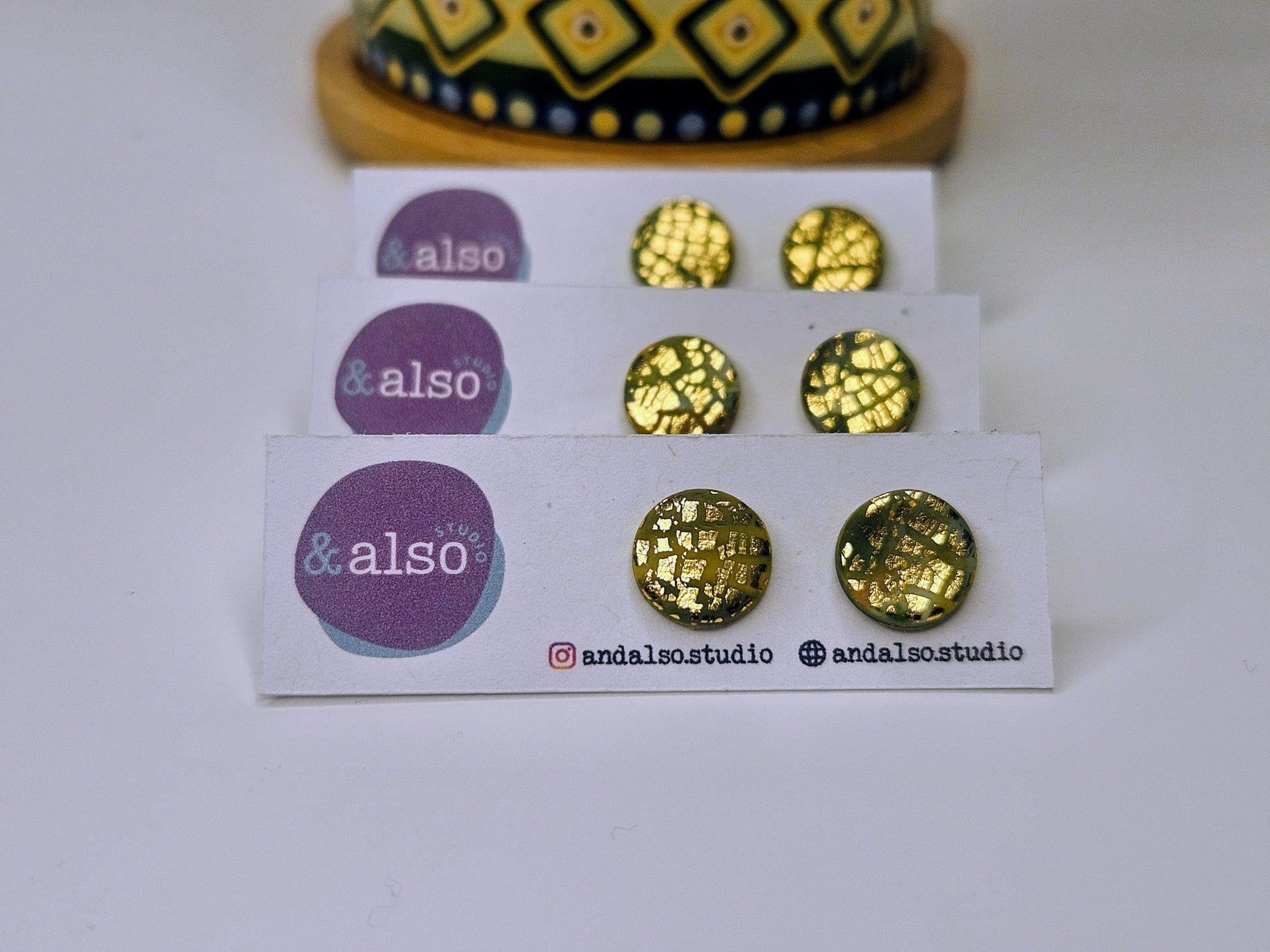 Olive clay overlaid with a broken gold-leaf grid. A refined, textured finish that adds a gentle highlight without overpowering. Large stud (10mm)