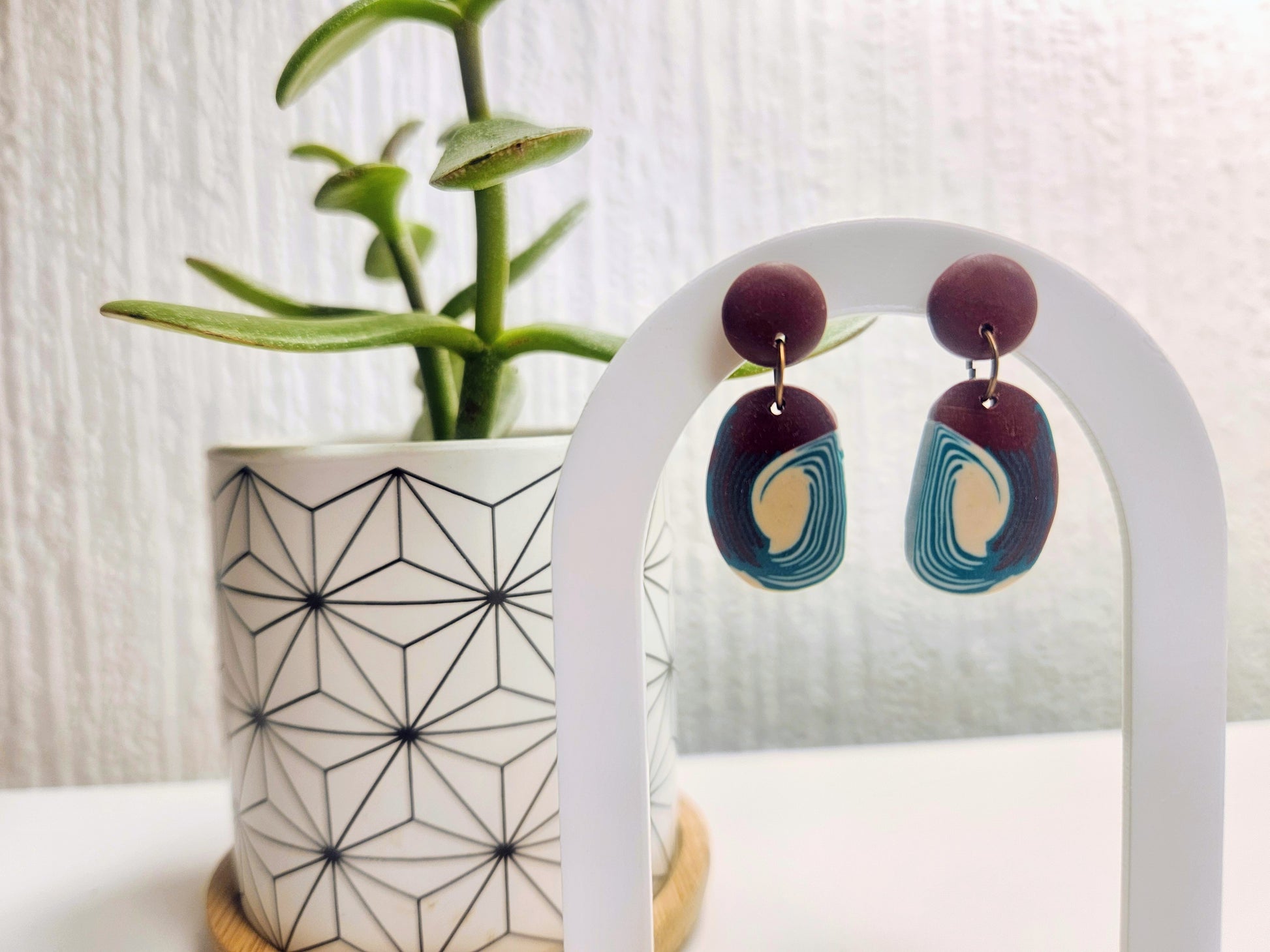 A rust maroon stud with patterned wavy drops in a gentle curve. The swirling contour effect gives each pair a sense of flow.