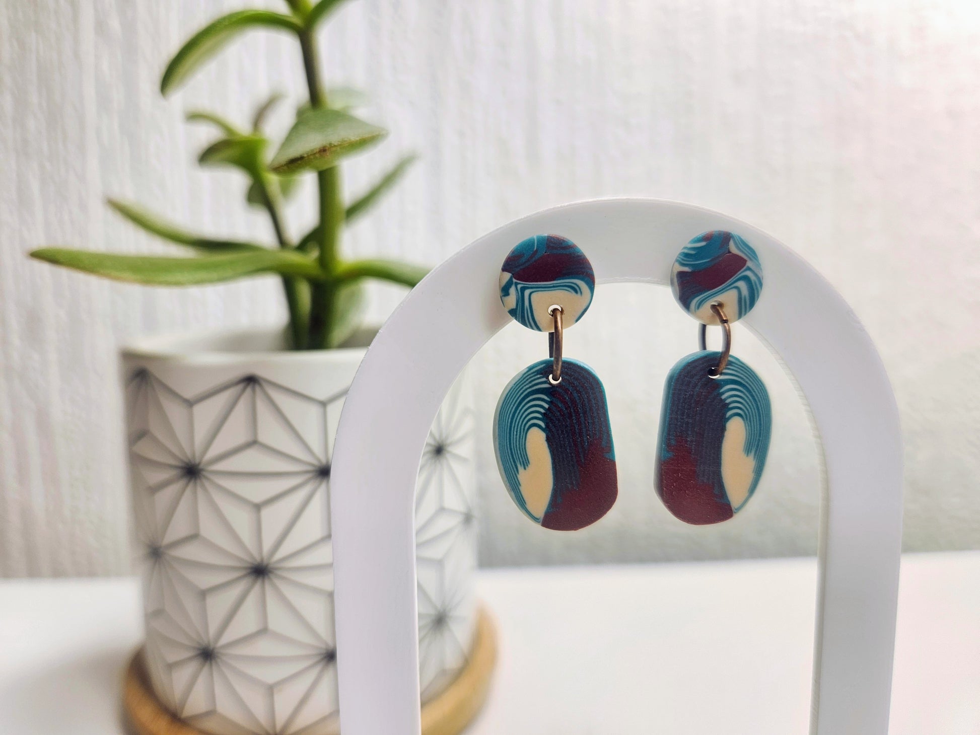 A teal, rust maroon and cream swirl stud with two patterned drops that stack in a gentle curve. The swirling contour effect gives each pair a sense of rhythm and flow.